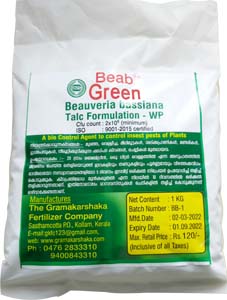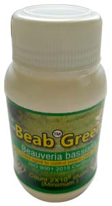 Beab Green contains Beauveria bassiana , a fungus that grows naturally in soil causing white muscardine disease to insect pests. This entomopathogenic fungus controls Beetles,Thirps, white flies, Aphids and Termites. Beab Green is very much effective against hard bodied insect pests. When the fungus come in to contact with the body of the insect host they germinate and the hyphae penetrate the insect’s body. The fungus develops inside the insect’s body within a few day causing death to the insect. After the death of the insect. the fungi multiply within the dead body of the host and their spores establish other insect population in the field. This will helps to maintain the population of insect pests well below the economic threshold level within a short period. Beab green is formulated as wettable powder or liquid formulation containing a minimum of 2 X 108 beauveria spores.