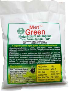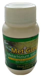 Met Green is a bio control agent containing Metarhizium anisopliae, an entomopathogenic fungus that grows naturally through out the world and causes diseases in more than 200 different insect specieses. The disease caused by the fungus is called green muscardine disease. When the fungus come in contact with the body of an insect host they germinate and the hyphae of the fungus penetrate the host’s body. The fungus develops inside the body of the insects and eventually kill the insect within few days. After the death of the insects the fungi multiply and their spores establish other insect population in the field and maintain their population under control.