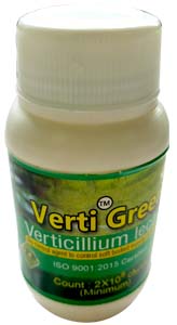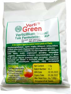 Verticillium can be used to control soft bodied pests causing damages in crops like tea, coffee, cardamom, clove, banana, grapes, citrus, vegetables, beetlevine, potato, floriculture crops, paddy etc. Verticillium is formulated as wettable powder or liquid formulation containing a minimum of 2 X 108 viable Verticillium spores per gram of carrier material. This fungi invades insects by penetrating their cuticle or skin and rapidly multiplies throughout the body causing death of insects caused by tissue destruction and effect of toxins. Even after the death of the insects this strain of fungi multiply on the dead insect. Thus pave way for establishing fungal population in the field and prevent further attack of the pests and the population of insect is maintained under control.